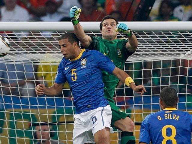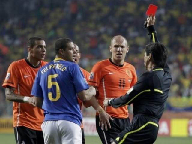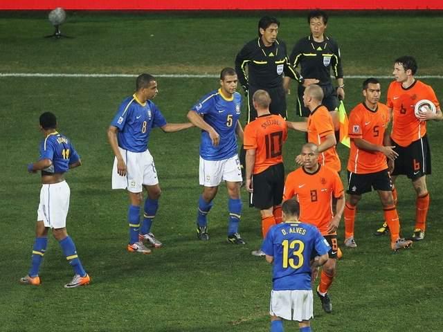 下半场开始,风云突变。荷兰队一脚传中,本来毫无威胁,梅洛却在出击的门将塞萨尔面前画蛇添足地跳了一下,干扰了队友,皮球鬼使神差地蹭着他的头顶飞进了自家大门——乌龙球!巴西被追平比分。