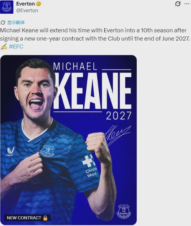 官方:埃弗顿宣布迈克尔-基恩续签了一年合同,这名中卫的新合同2027年到期。