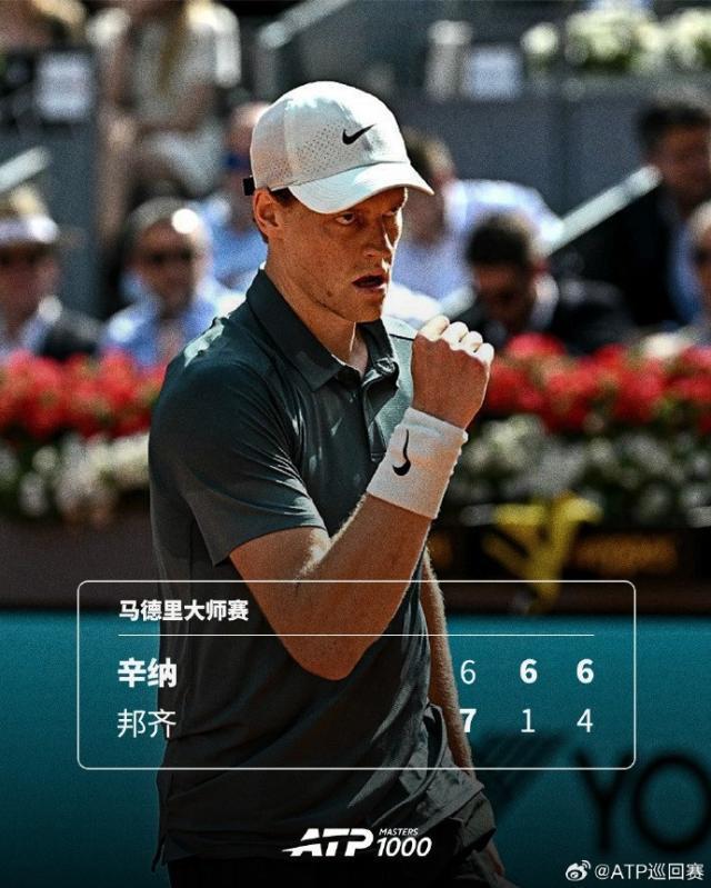 ATP1000马德里大师赛第二轮,辛纳逆转击败资格赛选手邦齐,晋级32强。三盘比分:6比7、6比1、6比4。辛纳豪取大师赛23连胜,晋级32强,接下来他将对阵另一位资格赛选手莫勒。