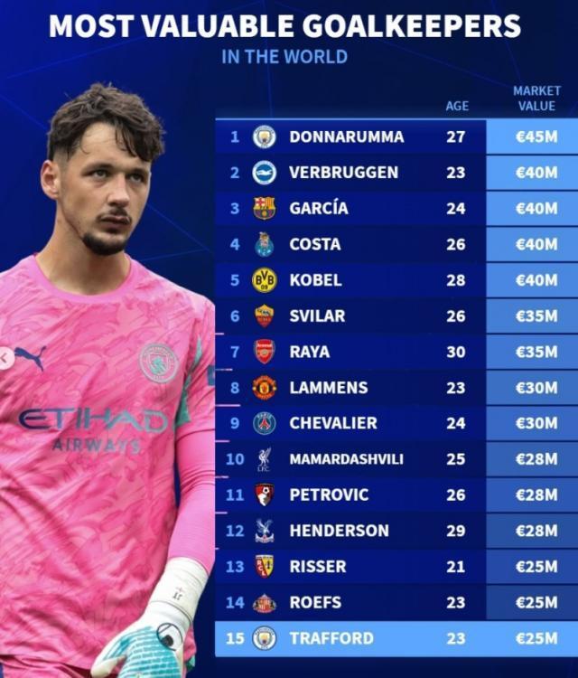 《转会市场》统计了当前门将身价排名前15球员,曼城一门多纳鲁马居首。德转列门将身价榜:欧元